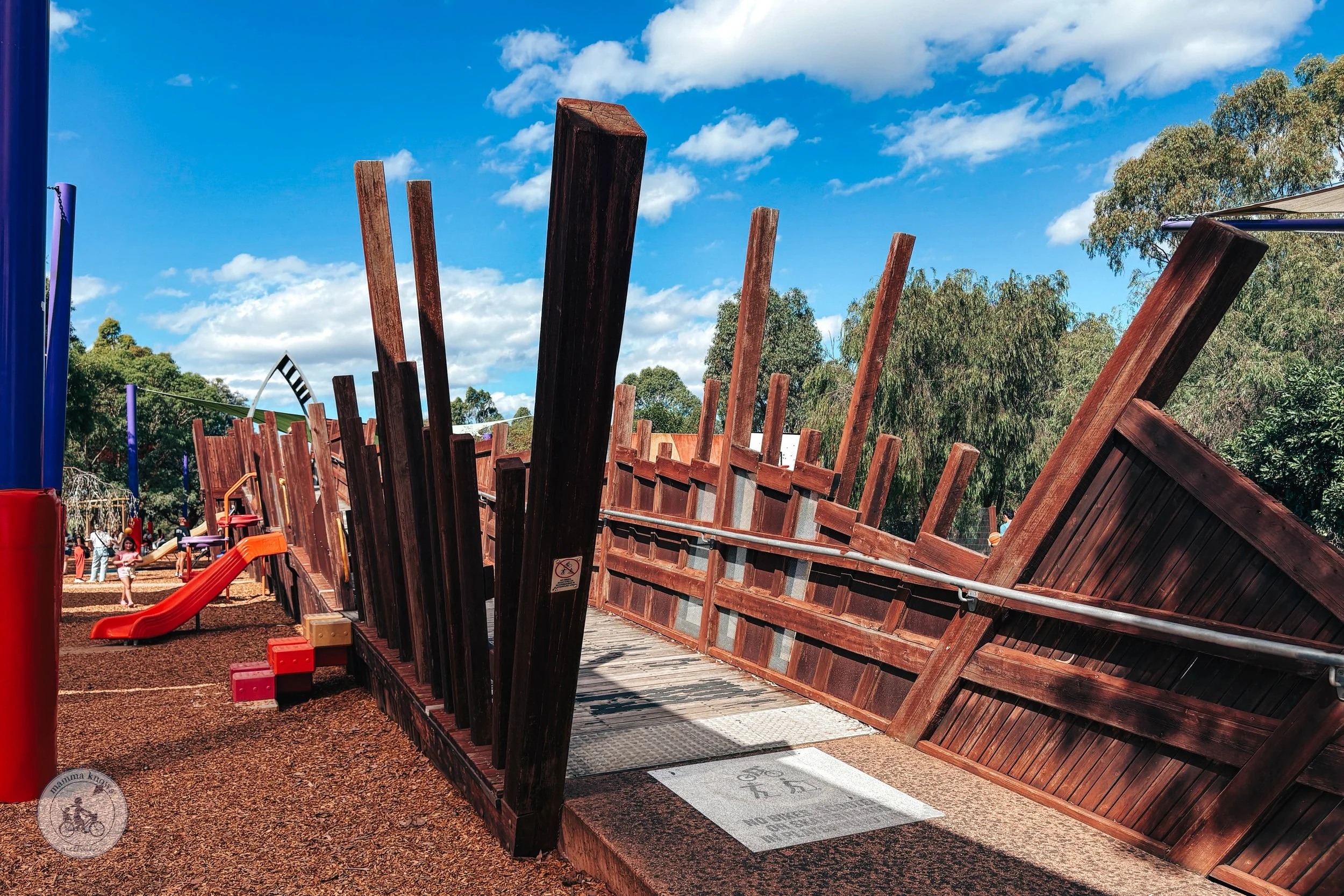 The centrepiece of the playground though is the epic wooden bridge-esque play structure that runs through its center and is the perfect runway for when kids get the ‘zoomies’. With slides, nets and climbing walls that jut out of its extremities, it truly is the heart of the space.